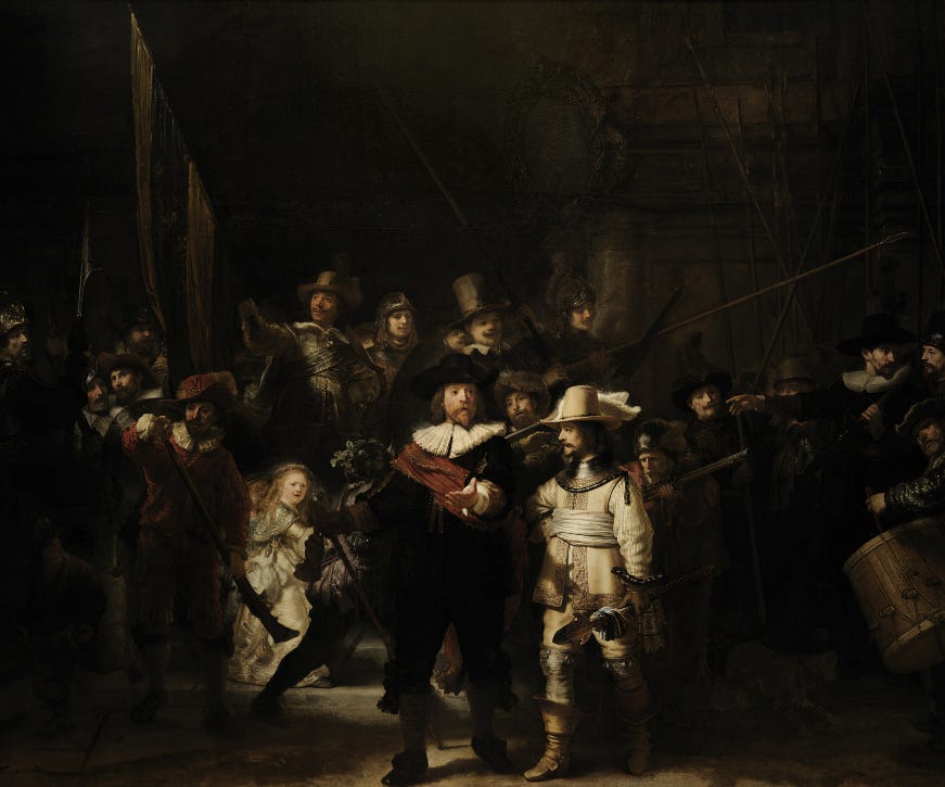 Let’s start with the name. Known as The Night Watch, the actual title of this painting is Militia Company of District II under the Command of Captain Frans Banninck Cocq. Or it may be The Shooting Company of Frans Banning Cocq and Willem van Ruytenburch. Very specific.